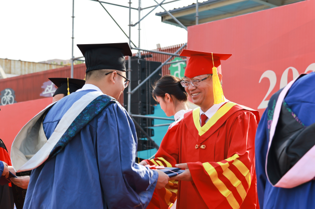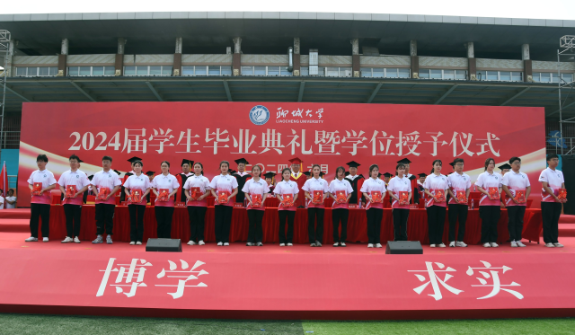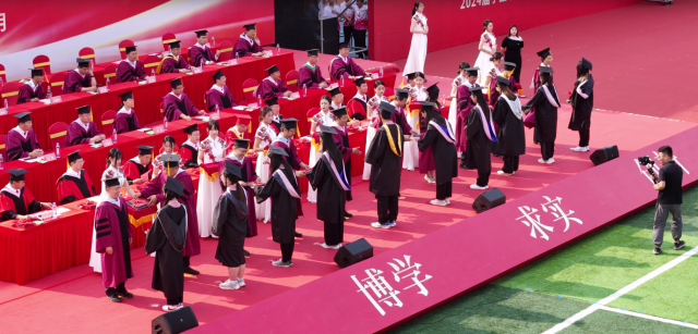 集团领导、学位委员会成员庄严地为毕业生代表颁发毕业证书和学位证书,拨正流苏,并同毕业生合影留念。党委领导班子成员为2024届优秀毕业生代表和为2024年西部计划志愿者代表颁发证书。关延平为2024年西部计划志愿服务团、研究生支教团授旗。
